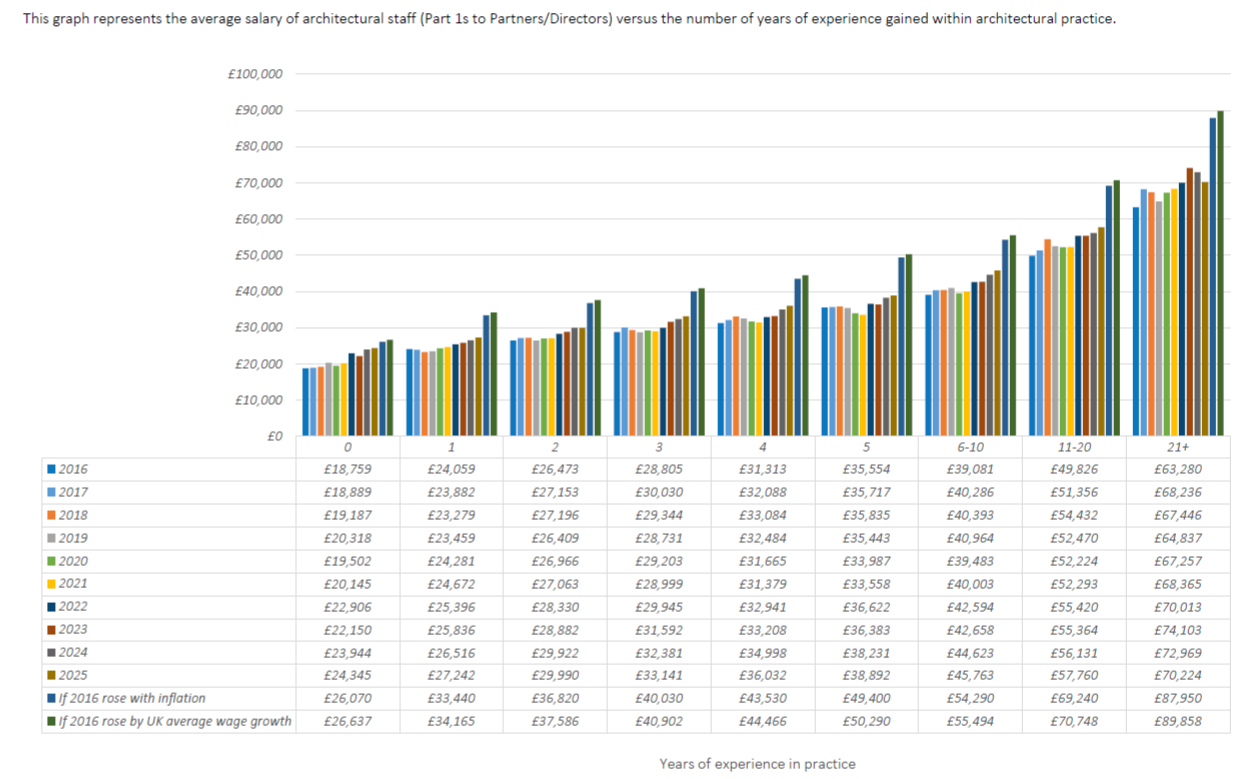 - Architectural pay has grown just 15.5% since 2016, compared with around 42% across the wider UK economy, resulting in long-term real-terms pay erosion.
